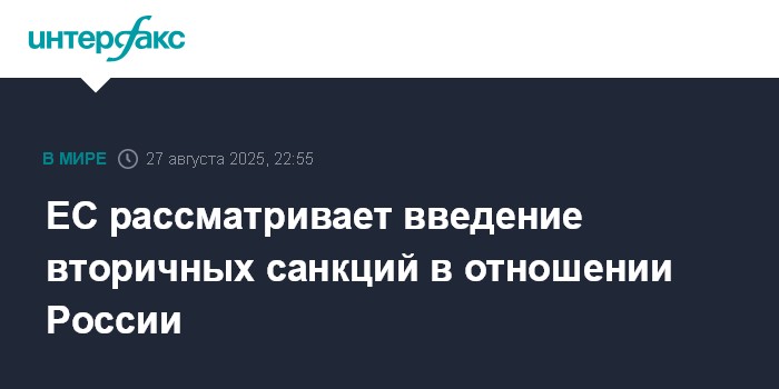 Москва. 27 августа. INTERFAX.RU - Страны ЕС рассматривают включение вторичных санкций в отношении России в 19-й санкционный пакет, сообщает в среду Bloomberg со ссылкой на источники.