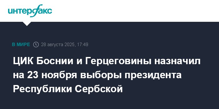 Москва. 28 августа. INTERFAX.RU - ЦИК Боснии и Герцеговины назначил на 23 ноября выборы президента Республики Сербской (в составе БиГ), который, как предполагается, придет на смену нынешнему лидеру Милораду Додику, сообщает в четверг агентство EFE.