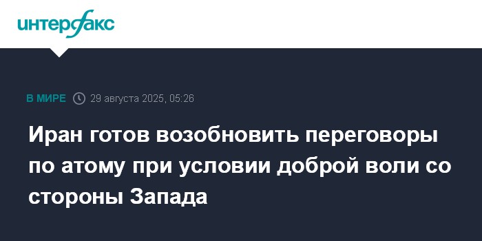 Москва. 29 августа. INTERFAX.RU - Глава МИД Ирана Аббас Аракчи в cвязи с сообщением "евротройки (Франция, ФРГ и Великобритания) о запуске "механизма быстрого реагирования" - восстановления санкций в отношении Тегерана - уведомил главу дипломатии ЕС Каю Каллас о готовности возобновить переговоры по ядерной программе при условии проявления Западом доброй воли.