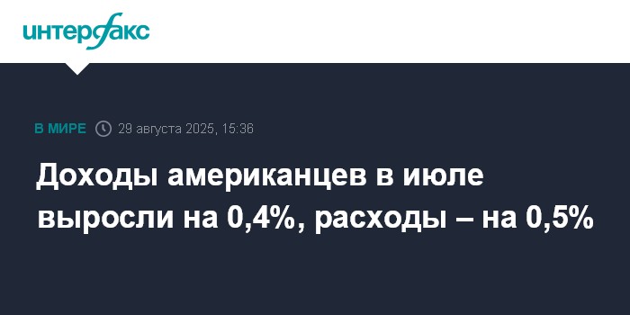 Москва. 29 августа. INTERFAX.RU - Доходы населения США в июле выросли на 0,4% по сравнению с предыдущим месяцем, расходы - на 0,5%, сообщается в отчете министерства торговли страны.