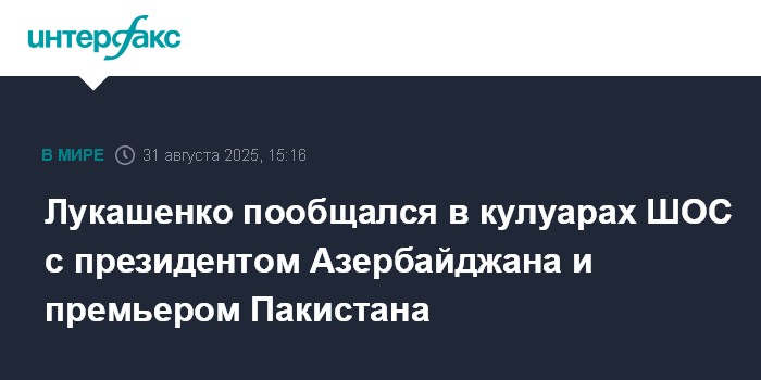 Москва. 31 августа. INTERFAX.RU - Президент Белоруссии Александр Лукашенко в кулуарах саммита Шанхайской организации сотрудничества в Тяньцзине пообщался с президентом Азербайджана Ильхамом Алиевым и премьером Пакистана Шахбазом Шарифом, сообщил в воскресенье близкий к президентской пресс-службе телеграм-канал "Пул Первого".