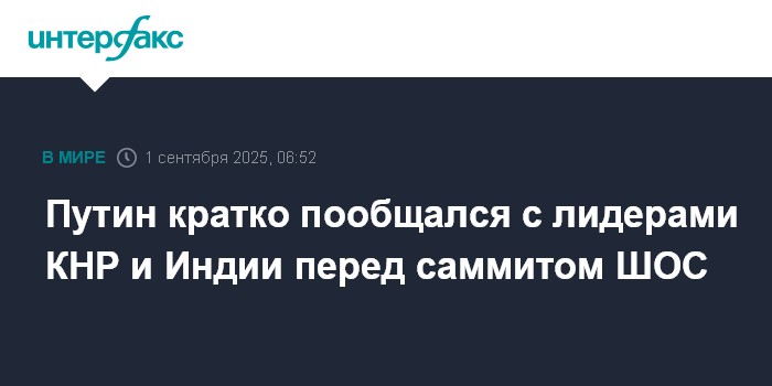 Москва. 1 сентября. INTERFAX.RU - Президент РФ Владимир Путин, председатель КНР Си Цзиньпин и премьер-министр Индии Нарендра Моди кратко пообщались перед саммитом ШОС.