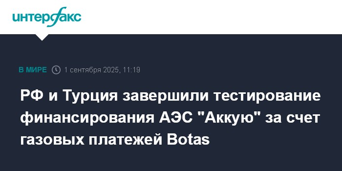 Москва. 1 сентября. INTERFAX.RU - РФ и Турция завершили тестирование механизма финансирования строительства АЭС "Аккую" за счет газовых платежей Botas, сообщил президент Турции Реджеп Тайип Эрдоган на встрече с президентом РФ Владимиром Путиным в китайском Тяньцзине.