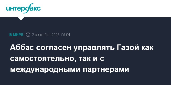 Москва. 2 сентября. INTERFAX.RU - Палестинская национальная администрация (ПНА) готова взять на себя управление сектором Газа, но при этом - не возражает и против участия в этом иностранных партнеров, заявил председатель ПНА Махмуд Аббас.