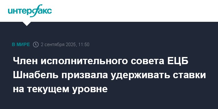 Москва. 2 сентября. INTERFAX.RU - Европейскому центральному банку (ЕЦБ) следует удерживать процентные ставки на текущем уровне, поскольку экономика еврозоны демонстрирует устойчивость, тогда как инфляция может оказаться выше, чем ожидается, считает член исполнительного совета ЕЦБ Изабель Шнабель.