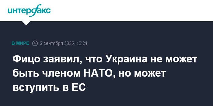 Москва. 2 сентября. INTERFAX.RU - Украина не должна становиться членом НАТО, но может вступит в ЕС после выполнения соответствующих требований, заявил премьер Словакии Роберт Фицо.
