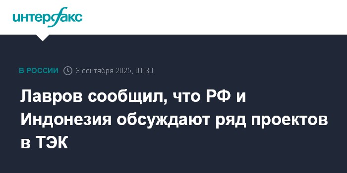 Москва. 3 сентября. INTERFAX.RU - Россия и Индонезия обсуждают ряд крупных совместных проектов в топливно-энергетическом комплексе - совместную добычу, переработку и поставки энергоресурсов, новые горизонты могут открыться с заключением соглашения о свободной торговле между Индонезией и Евразийским экономическим союзом, сообщил глава МИД РФ Сергей Лавров в интервью индонезийской газете "Компас".
