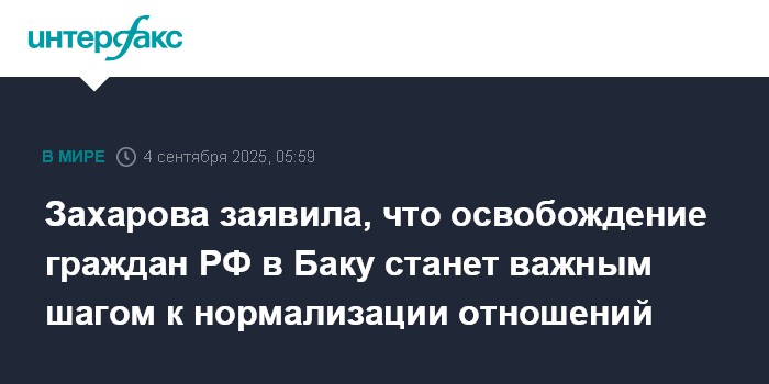 "Подчеркиваем, освобождение российских граждан является важным шагом на пути к нормализации ситуации в отношениях между Россией и Азербайджаном", - сказала Захарова на брифинге "на полях" Восточного экономического форума (ВЭФ).