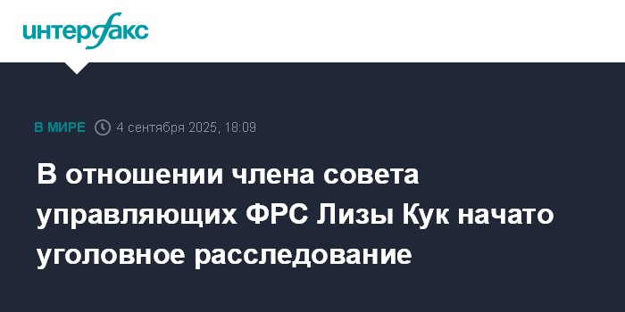 Москва. 4 сентября. INTERFAX.RU - Министерство юстиции США начало уголовное расследование в отношении члена совета управляющих Федеральной резервной системы (ФРС) Лизы Кук, сообщает The Wall Street Journal.