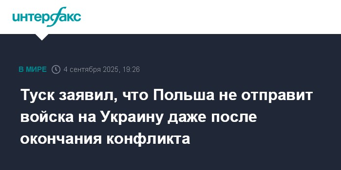 Москва. 4 сентября. INTERFAX.RU - Польша не отправит своих военнослужащих на Украину даже после окончания конфликта, заявил журналистам в четверг польский премьер-министр Дональд Туск по итогам встречи "коалиции желающих" в Париже.