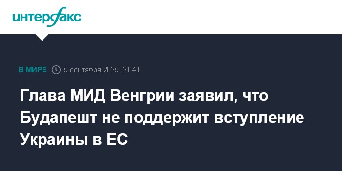 Москва. 5 сентября. INTERFAX.RU - Будапешт по-прежнему выступает против вступления Украины в ЕС, заявил в пятницу глава венгерского МИД Петер Сийярто.