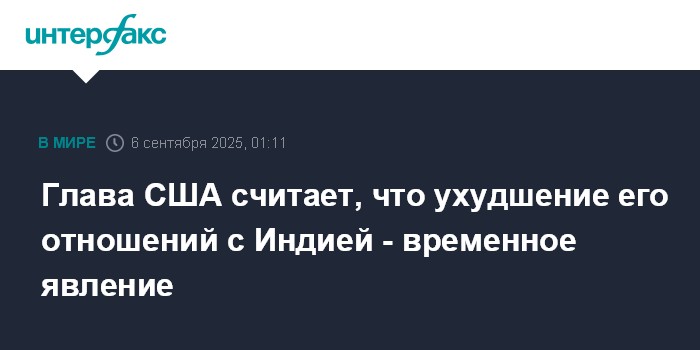 Москва. 6 сентября. INTERFAX.RU - Президент США Дональд Трамп заявил, что считает временным ухудшение его отношений с Индией.