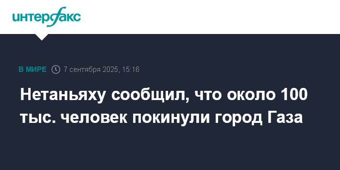 Москва. 7 сентября. INTERFAX.RU - Около 100 тыс. мирных жителей покинули город Газа на фоне планируемой военной операции Армии обороны Израиля (ЦАХАЛ), заявил премьер-министр Биньямин Нетаньяху в воскресенье.
