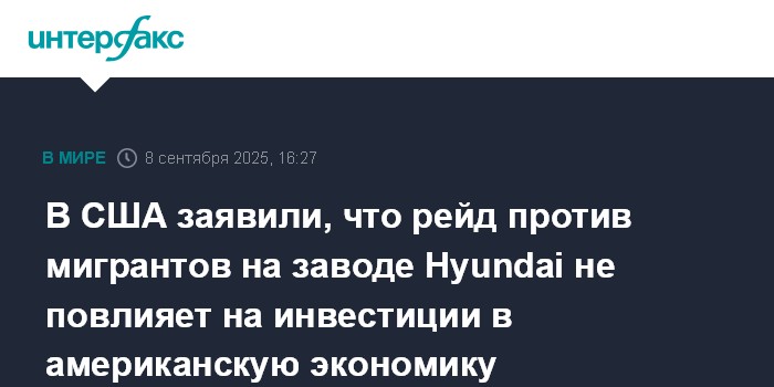 Москва. 8 сентября. INTERFAX.RU - Министр внутренней безопасности США Кристи Ноэм заявила, что ситуация с задержанием граждан Южной Кореи в ходе антимиграционного рейда на заводе Hyundai Motor Group и LG Energy Solution не несет негативных последствий для инвестиций в экономику США.