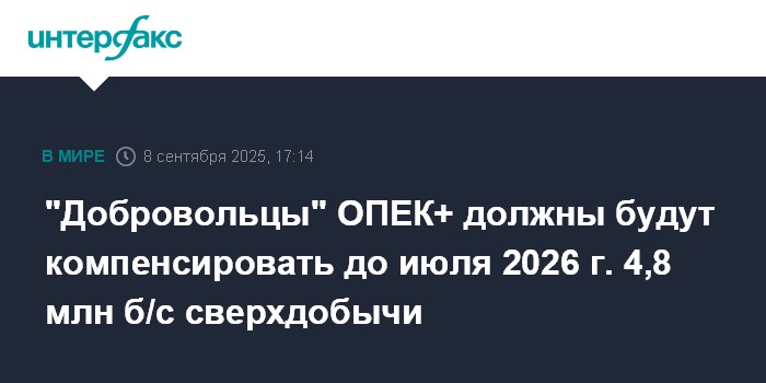 Москва. 8 сентября. INTERFAX.RU - Страны ОПЕК+, которые ранее объявили о добровольных ограничениях производства нефти, но превысили установленные квоты, должны компенсировать до июля 2026 года 4,779 млн б/с накопленной сверхдобычи, говорится в сообщении ОПЕК.