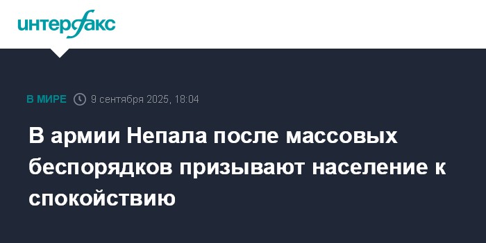 Москва. 9 сентября. INTERFAX.RU - Начальник штаба Армии Непала Ашок Радж Сигдел в видеообращении к согражданам призвал их к сдержанности на фоне массовых протестов в стране и беспорядков, сообщает портал Khabarhub.