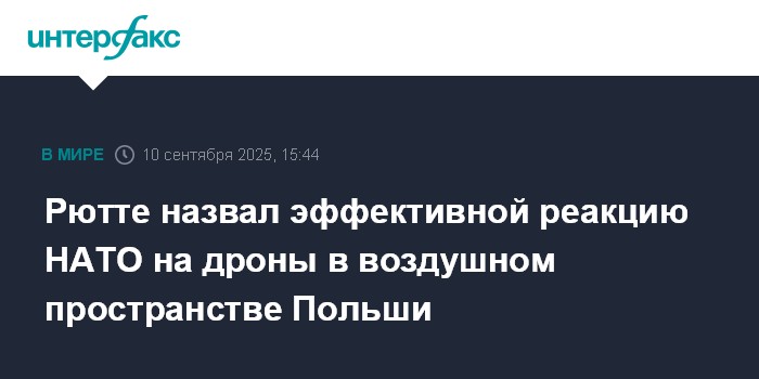 Москва. 10 сентября. INTERFAX.RU - НАТО эффективно отреагировала на вторжение беспилотников в воздушное пространство Польши, заявил генсек альянса Марк Рютте.