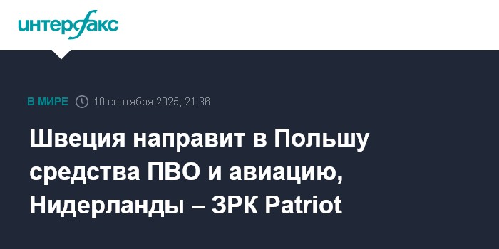 Москва. 10 сентября. INTERFAX.RU - Швеция срочно направит в Польшу средства ПВО и авиацию, сообщил в среду глава польского Минобороны Владислав Косиняк-Камыш.