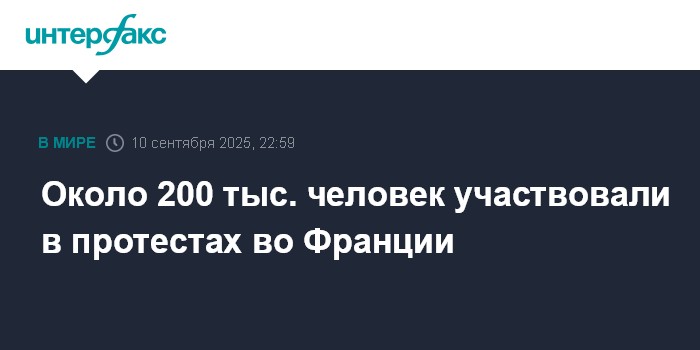 Москва. 10 сентября. INTERFAX.RU - Министр внутренних дел Франции Брюно Ретайо заявил, что около 200 тыс. человек участвовали в среду в стране в массовых акциях в рамках движения протеста "Заблокируем все", пишет газета Ouest-France.