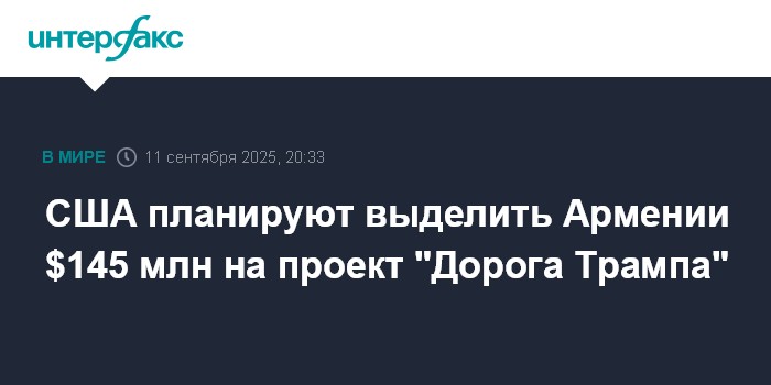 "В сотрудничестве с Конгрессом мы планируем предоставить Армении $145 млн. Это первый транш финансирования в рамках инициативы "Дорога Трампа к международному миру и процветанию" и связанных с ней соглашений, достигнутых 8 августа", - сказал он.