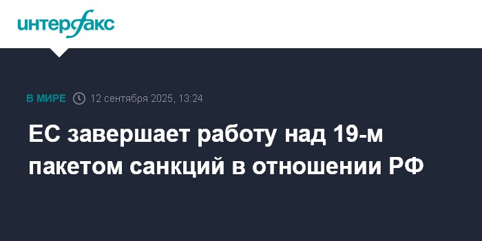 Официальный представитель ЕК Олоф Жилл заявил 11 сентября, что пока преждевременно говорить, когда будут объявлены детали или сроки 19-го пакета антироссийских санкций, а также раскрывать содержание консультаций в США спецпредставителя ЕС по санкциям Дэвида О'Салливана.