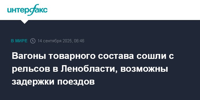 Москва. 14 сентября. INTERFAX.RU - В Лужском районе Ленинградской области сошли с рельсов три вагона порожнего товарного состава, возможны задержки пассажирских поездов, сообщил губернатор Александр Дрозденко.