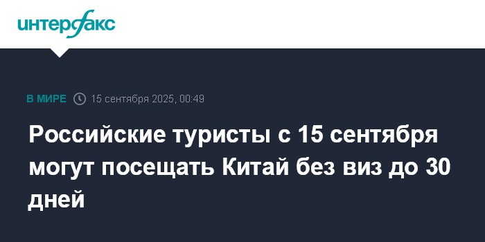 Москва. 15 сентября. INTERFAX.RU - Китай ввел пробный безвизовый режим для россиян на год, теперь российские туристы могут приехать в страну только с загранпаспортом на срок до 30 дней.