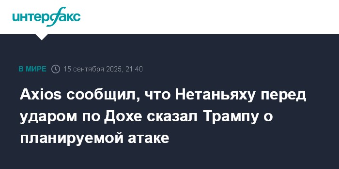 "Трое израильских чиновников, непосредственно знакомых с этой темой, сообщили Axios, что Нетаньяху утром 9 сентября проинформировал Трампа о планируемой атаке незадолго до того, как Израиль совершил ее", - информирует портал.