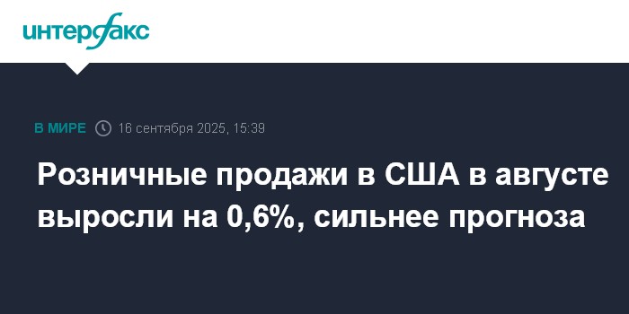 Москва. 16 сентября. INTERFAX.RU - Розничные продажи в США в августе увеличились на 0,6% относительно предыдущего месяца, сообщило министерство торговли страны.