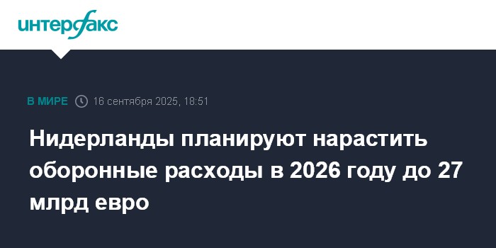 Москва. 16 сентября. INTERFAX.RU - Власти Нидерландов, в соответствии со своими обязательствами в рамках НАТО по наращиванию ежегодных оборонных расходов в 5% от ВВП, намерены увеличить траты на военные нужды в 2026 году до 27 млрд евро, передает Bloomberg.