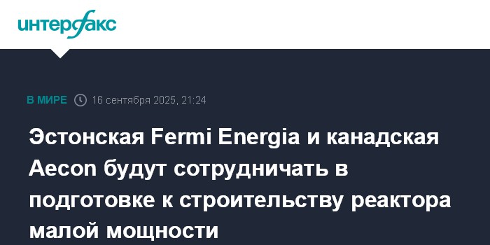 Москва. 16 сентября. INTERFAX.RU - Эстонская Fermi Energia AS подписала с канадской компанией Aecon соглашение о сотрудничестве в рамках проекта строительства в Эстонии малого модульного реактора BWRX-300, сообщает портал телерадиовещания ERR.