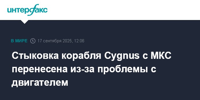 Москва. 17 сентября. INTERFAX.RU - Стыковка американского грузового космического корабля Cygnus корпорации Northrop Grumman с Международной космической станцией, планировавшаяся 17 сентября, перенесена из-за нештатной работы основного двигателя, сообщило NASA.