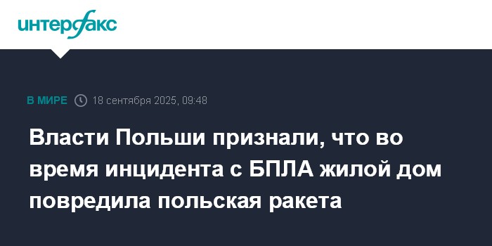 Москва. 18 сентября. INTERFAX.RU - Причиной повреждения жилого дома в населенном пункте Вырыки в Люблинском воеводстве в ходе операции по противодействию залетевших в Польшу дронам стала выпущенная с польского истребителя ракета, сообщил министр-координатор спецслужб Польши Томаш Семоняк. Его цитируют польские СМИ.