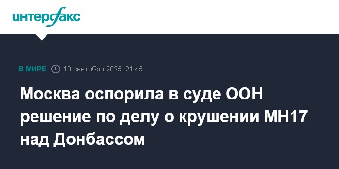 Как сообщает в четверг МИД России на своем сайте, "18 сентября Российская Федерация в соответствии со статьей 84 Конвенции о международной гражданской авиации 1944 года (Чикагская конвенция) оспорила в Международном суде ООН безосновательное решение Совета Международной организации гражданской авиации (ИКАО) о якобы причастности России к гибели малайзийского "Боинга" рейса MH17".