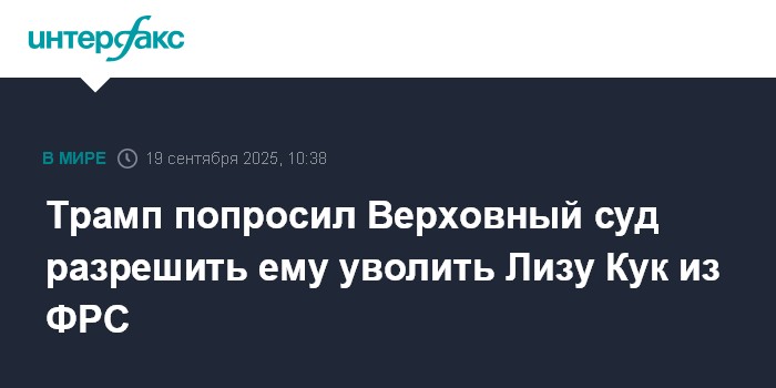 Москва. 19 сентября. INTERFAX.RU - Президент США Дональд Трамп обратился в Верховный суд с просьбой разрешить ему отстранить члена совета управляющих Федеральной резервной системы Лизу Кук от должности на время, пока идет рассмотрение ее иска к президенту.