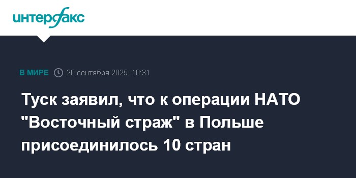 Москва. 20 сентября. INTERFAX.RU - К операции НАТО Eastern Sentry ("Восточный страж") в Польше уже присоединилось десять стран, сообщил премьер-министр Польши Дональд Туск.