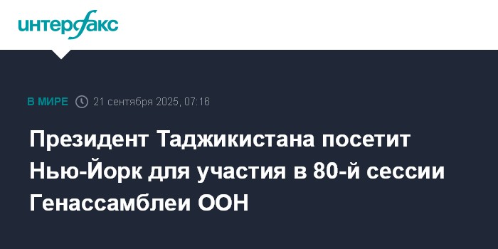 Москва. 21 сентября. INTERFAX.RU - Президент Таджикистана Эмомали Рахмон отбыл в Нью-Йорк для участия в 80-й сессии Генеральной Ассамблеи Организации Объединенных Нации, сообщает в воскресенье пресс-служба таджикского лидера.