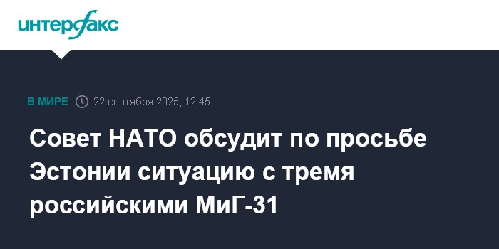 Москва. 22 сентября. INTERFAX.RU - Североатлантический совет соберется 23 сентября по запросу Эстонии для обсуждения, как утверждают в Таллине, пролета трёх российских истребителей МиГ-31 в воздушном пространстве страны, информирует Le Figaro.