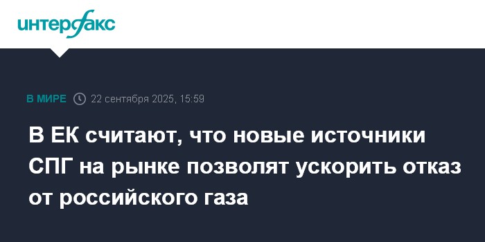 Москва. 22 сентября. INTERFAX.RU - Одна из причин инициативы ускорения ранее предложенных сроков отказа ЕС от газа РФ в том, что на рынке энергоресурсов появились новые источники СПГ, заявила официальный представитель Еврокомиссии (ЕК) Анна-Кайса Итконен.