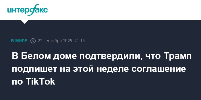 Москва. 22 сентября. INTERFAX.RU - Президент США Дональд Трамп позже на этой неделе подпишет сделку по соцсети TikTok, сообщили в понедельник в Белом доме.