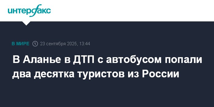 Москва. 23 сентября. INTERFAX.RU - Утром 23 сентября у города Аланья столкнулись два автобуса, в ДТП попали больше 20 российских туристов, есть пострадавшие, сообщили "Интерфаксу" в генконсульстве России в Анталье.