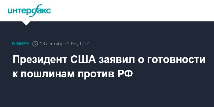 Москва. 23 сентября. INTERFAX.RU - Президент США Дональд Трамп, выступая на сессии Генассамблеи ООН во вторник, заявил, что Вашингтон готов ввести новые пошлины против России в случае отсутствия сделки по украинскому урегулированию.
