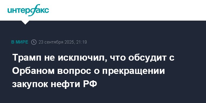Москва. 23 сентября. INTERFAX.RU - Президент США Дональд Трамп заявил, что может обсудить с премьер-министром Венгрии Виктором Орбаном вопрос о прекращении покупки нефти из РФ, после чего Будапешт может прекратить делать это.