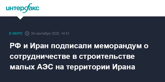 Москва. 24 сентября. INTERFAX.RU - Россия и Иран подписали меморандум о взаимопонимании и сотрудничестве в сооружении атомных станций малой мощности на территории Ирана. Об этом сообщил "Росатом" по итогам встречи гендиректора госкорпорации Алексея Лихачева и вице-президента страны Мохаммада Эслами.