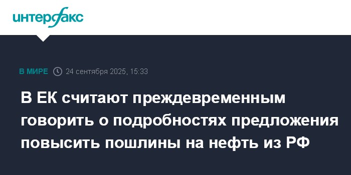 Москва. 24 сентября. INTERFAX.RU - Заявление главы Еврокомиссии (ЕК) Урсулы фон дер Ляйен о планах повысить таможенные пошлины на российскую нефть пока рано комментировать в подробностях, заявил официальный представитель ЕК Олоф Жилл.