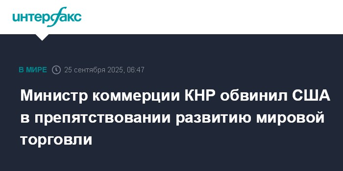 Москва. 25 сентября. INTERFAX.RU - Использование США односторонних пошлин в качестве давления на другие страны препятствует развитию многосторонней торговой системы и стабилизации мировой экономики, заявил министр коммерции КНР Ван Вэньтао.