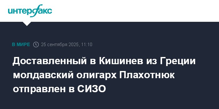Москва. 25 сентября. INTERFAX.RU -Экстрадированный из Греции молдавский беглый олигарх Владимир Плахотнюк доставлен в Кишинев и помещен в следственный изолятор пенитенциарного учреждения № 13.