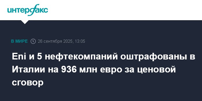 Москва. 26 сентября. INTERFAX.RU - Антимонопольный регулятор Италии (AGCM) оштрафовал шесть нефтяных компаний на 936 млн евро за сговор по ценам на топливо. Это один из самых крупных штрафов, наложенных национальным регулятором в Европе, отмечает Financial Times.