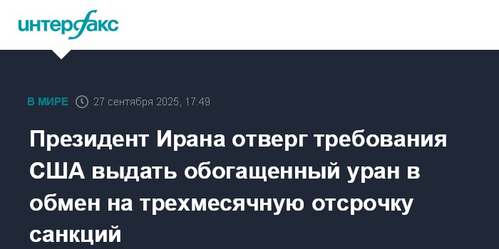 Москва. 27 сентября. INTERFAX.RU - Иран назвал непомерными требования Вашингтона передать более 400 кг урана, обогащенного до 60%, в обмен на трехмесячную отсрочку восстановления санкций против Тегерана.