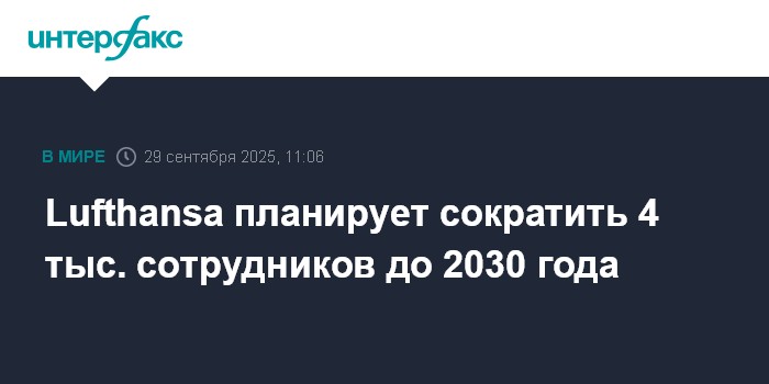 Москва. 29 сентября. INTERFAX.RU - Deutsche Lufthansa планирует сократить около 4 тыс. работников до 2030 года в рамках программы, направленной на повышение эффективности операций, в том числе за счет внедрения технологий искусственного интеллекта.